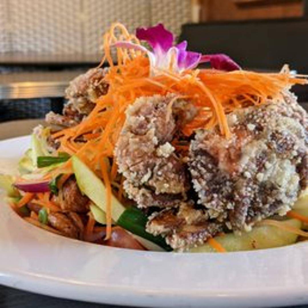 Crispy, lightly battered soft shell crab, served with a choice of Thai dipping sauce (e.g., sweet chili sauce, spicy lime sauce, or peanut sauce). Often served over a bed of mixed greens or shredded cabbage. The crab is cooked until golden brown and the shell is completely edible.