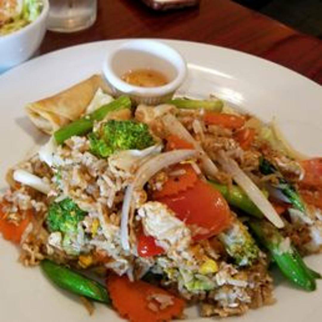 Savory fried rice cooked with traditional Thai seasonings. Features fluffy rice stir-fried with egg, onions, carrots, peas, and your choice of protein. Seasoned with soy sauce, fish sauce, and a hint of sweetness. Garnished with cilantro and lime.