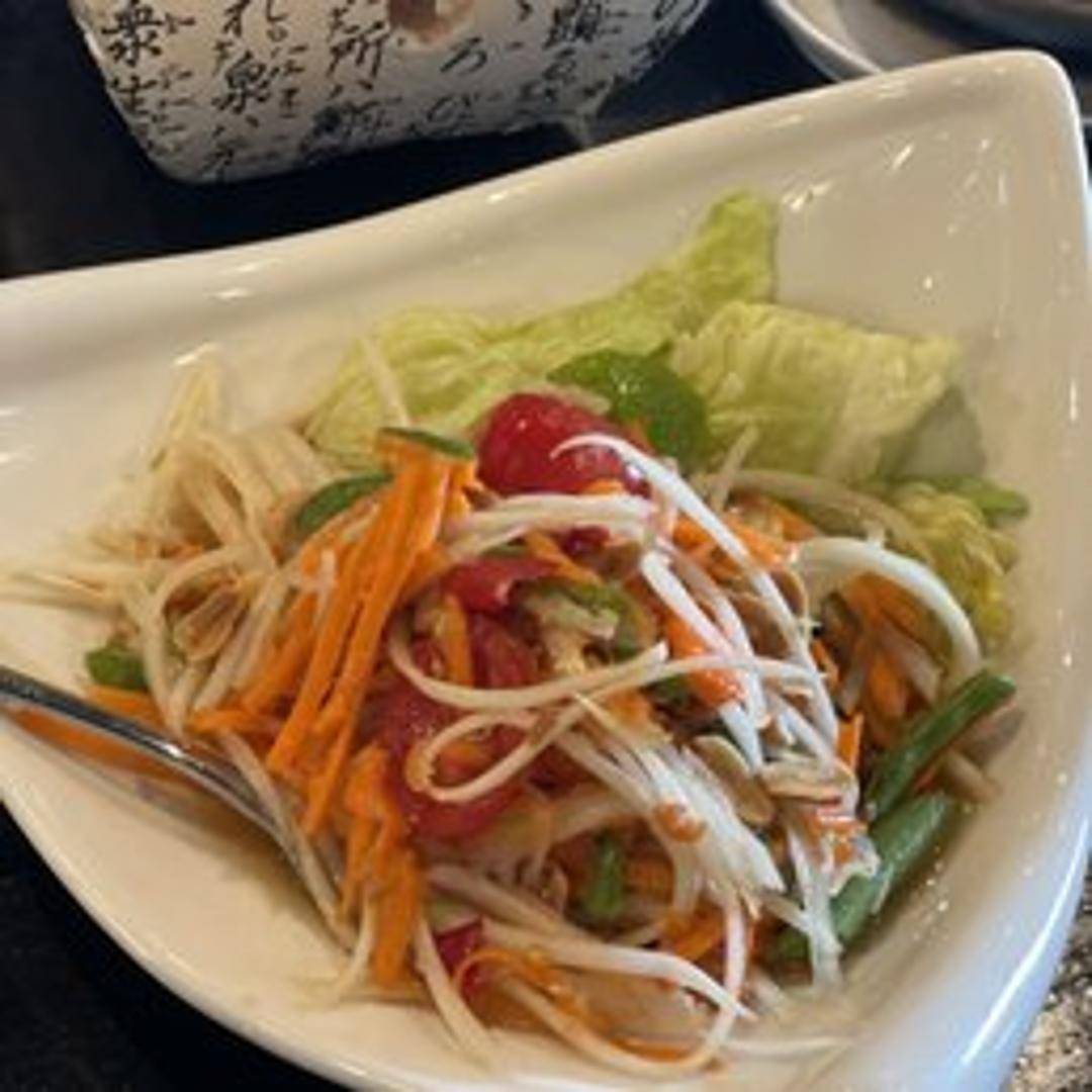 Shredded green papaya with tomatoes, green beans, peanuts, chili, garlic, lime juice, and fish sauce.