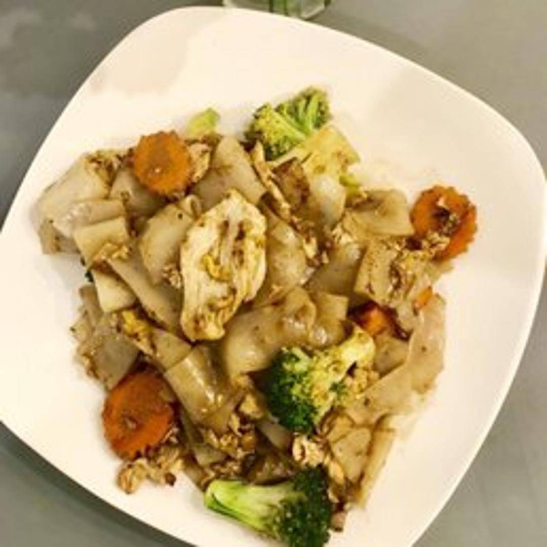Stir-fried wide rice noodles with your choice of protein, Chinese broccoli, egg, and a savory dark soy sauce.