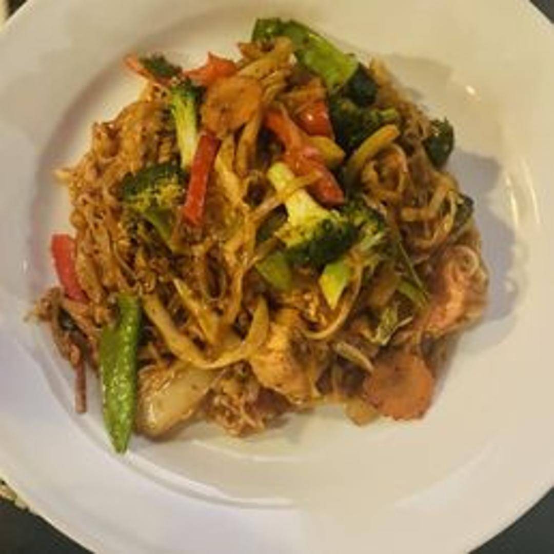 Wide rice noodles stir-fried with basil, bell peppers, onions, tomatoes, chili peppers, and your choice of protein in a flavorful sauce.