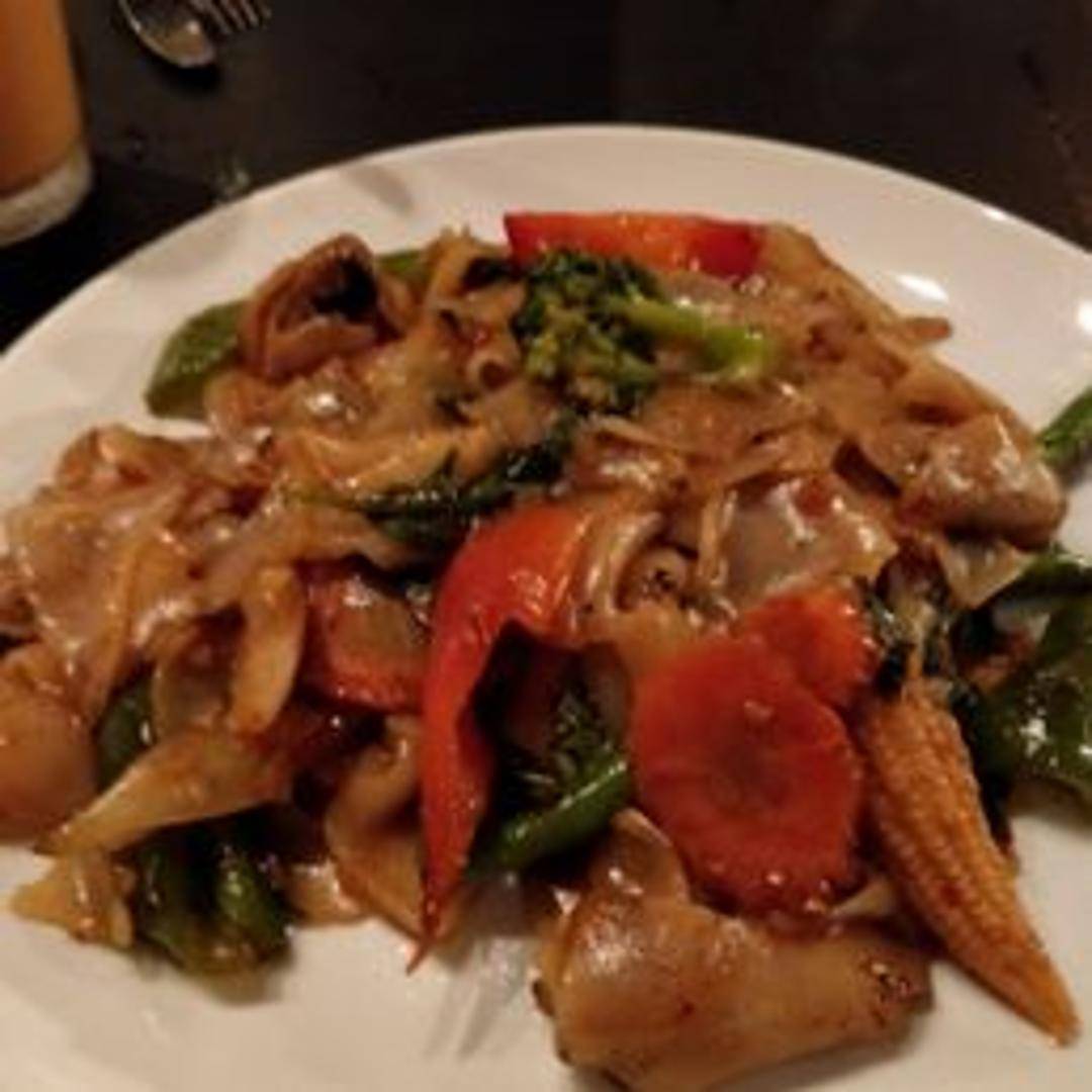 Wide rice noodles stir-fried with onions, bell peppers, basil, and chili garlic sauce. A fiery and flavorful noodle dish.