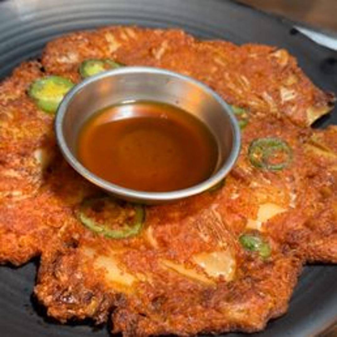 Kimchi Jeon. A savory pancake made with fermented kimchi, flour, and other vegetables. Crispy on the outside and slightly chewy on the inside, it's a flavorful and tangy Korean appetizer.