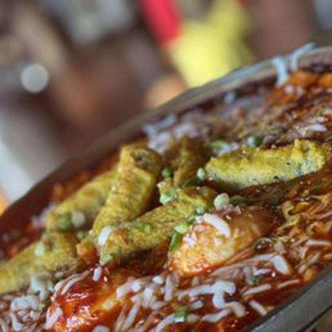 Tteokbokki. Chewy rice cakes simmered in a spicy and sweet Gochujang-based sauce with fish cakes and vegetables. A popular Korean street food dish.