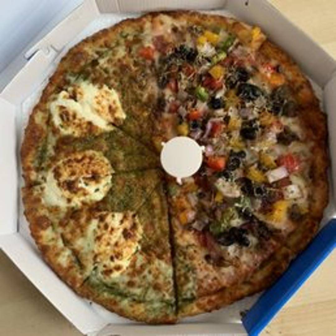 Our loaded pizza featuring a crispy crust, a tangy tomato sauce base, and a combination of premium toppings including savory pepperoni, Italian sausage, fresh green peppers, mushrooms, and black olives, all covered in melted mozzarella cheese.