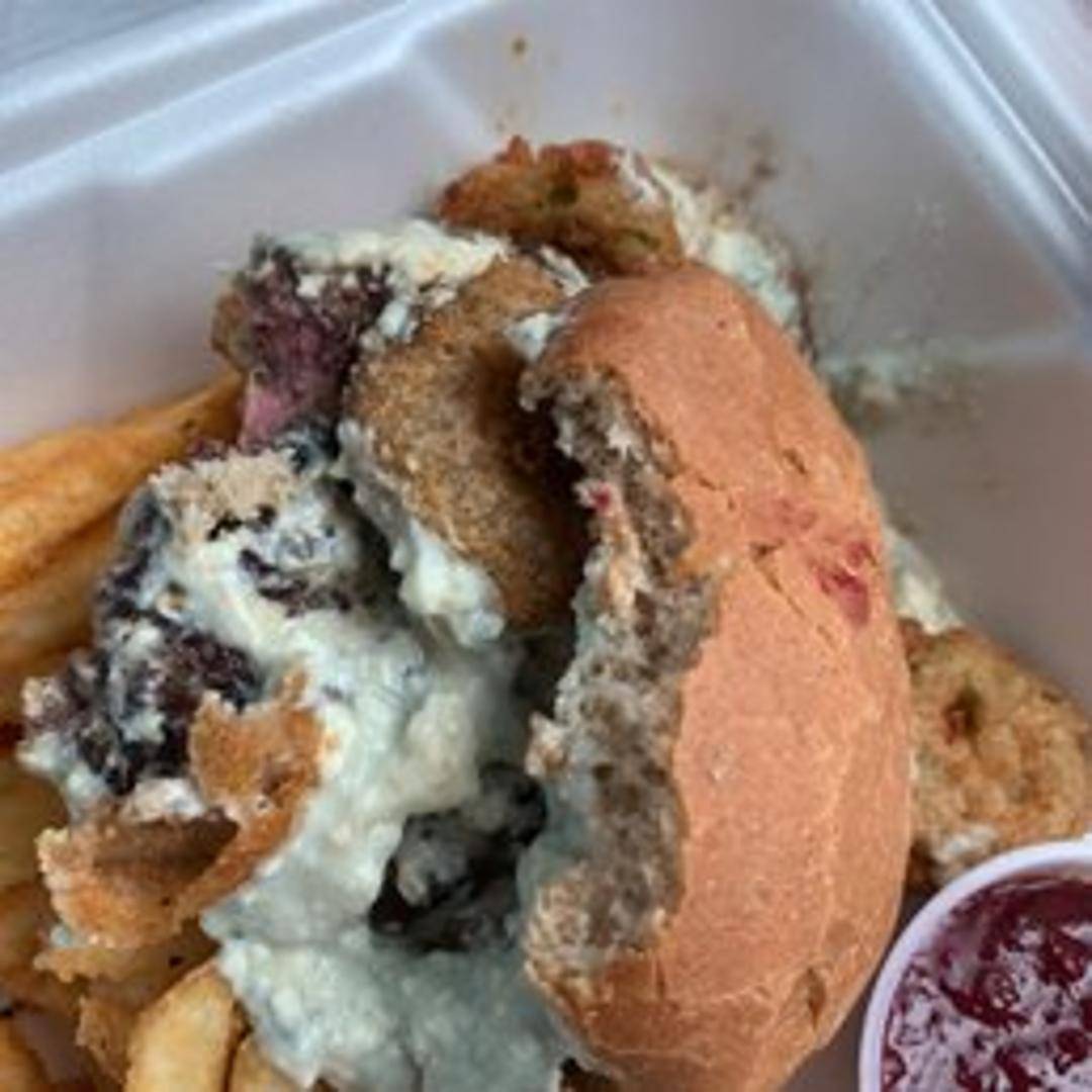 A half-pound burger with blackberry bourbon jam, crispy bacon, goat cheese and arugula served on a toasted brioche bun.