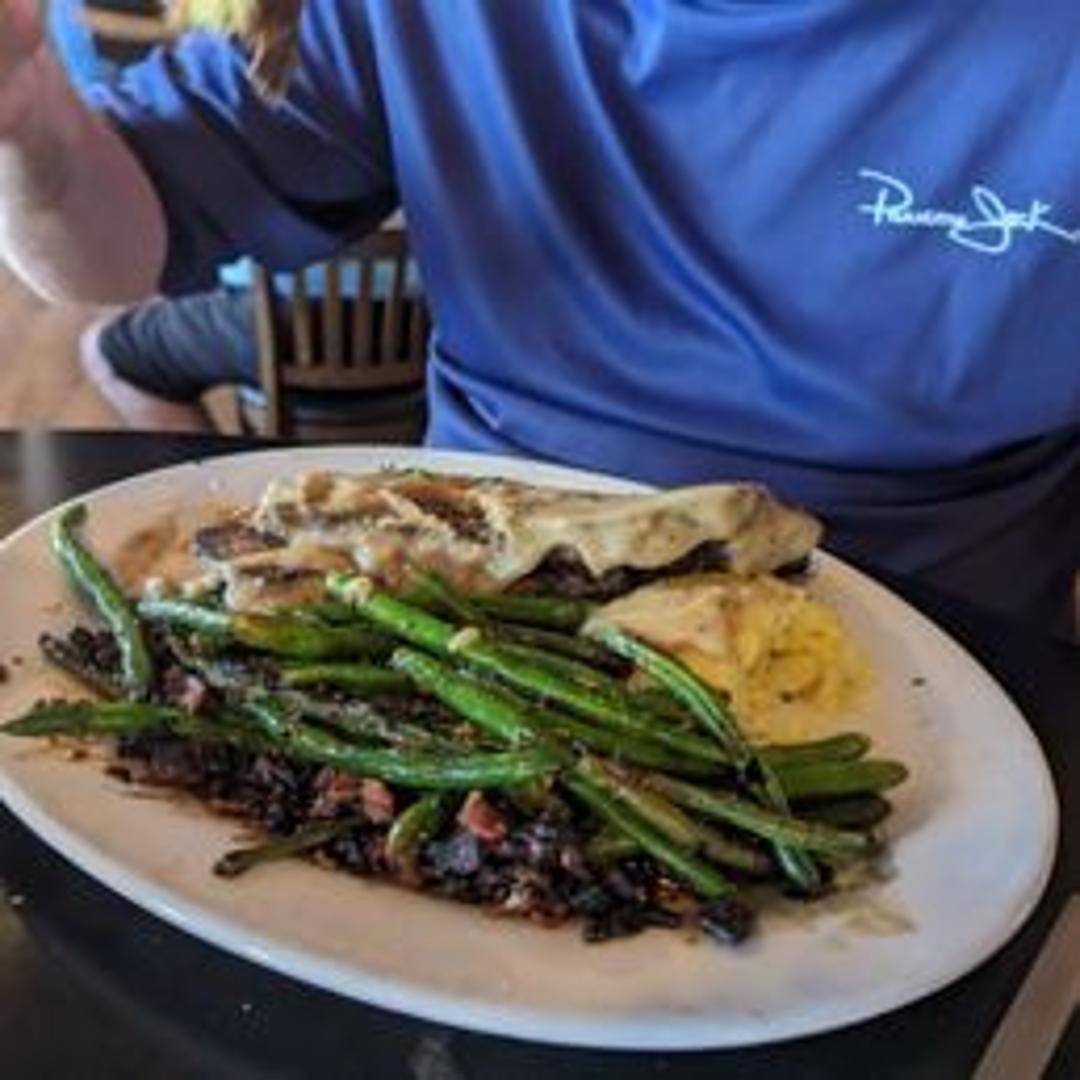 Homemade elk meatloaf served with mashed potatoes, gravy, and your choice of one side.
