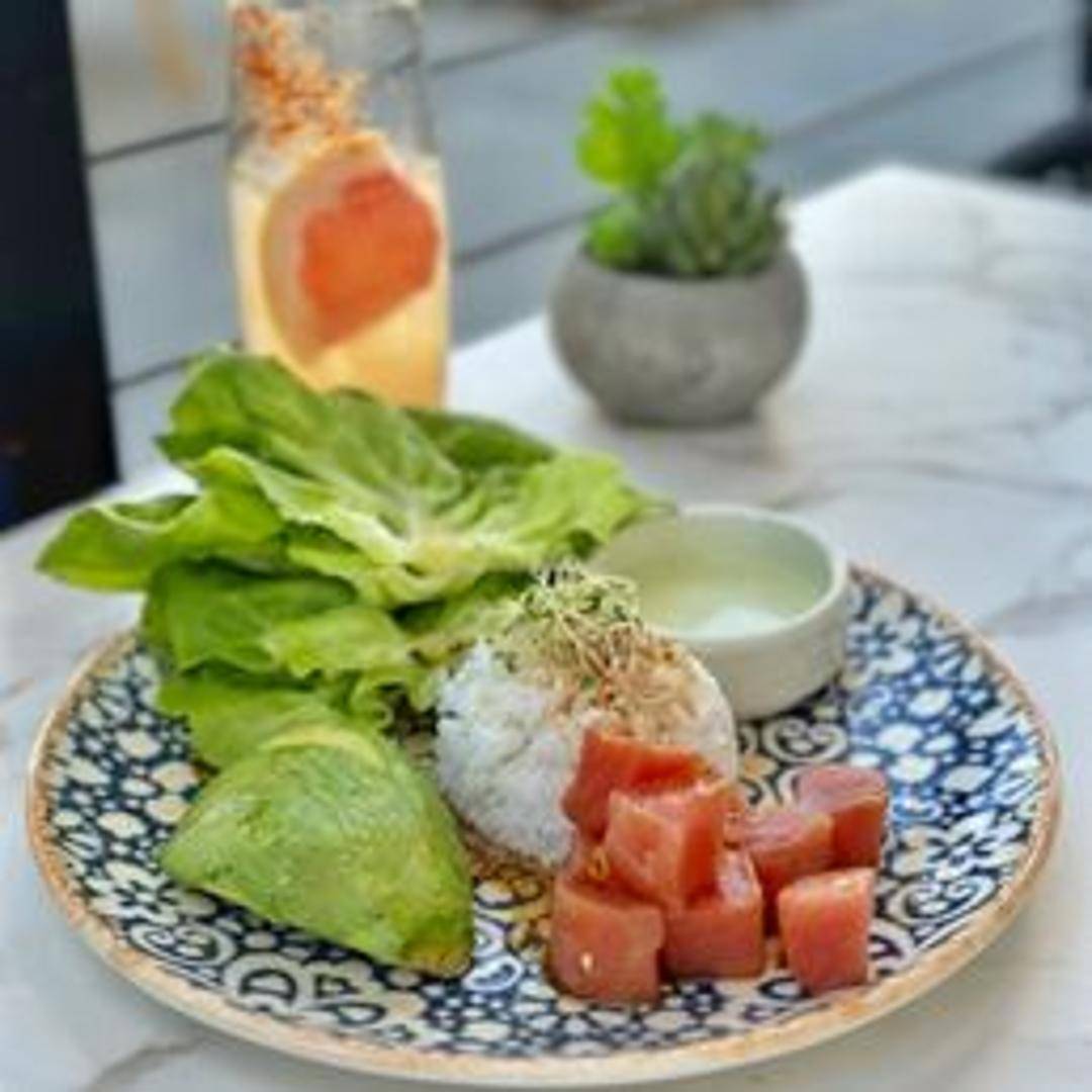 Marinated raw fish (choice of tuna or salmon) wrapped in seaweed with sushi rice, avocado, cucumber, and a spicy mayo sauce.