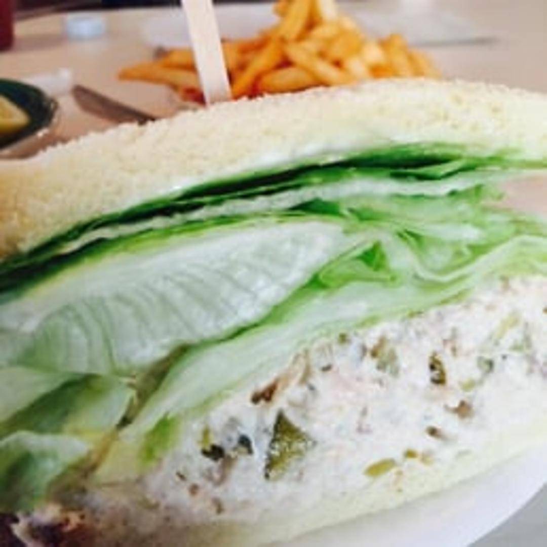 A simple and satisfying sandwich featuring a generous portion of albacore tuna salad, seasoned with mayonnaise, celery, and seasonings, served cold on your choice of bread.