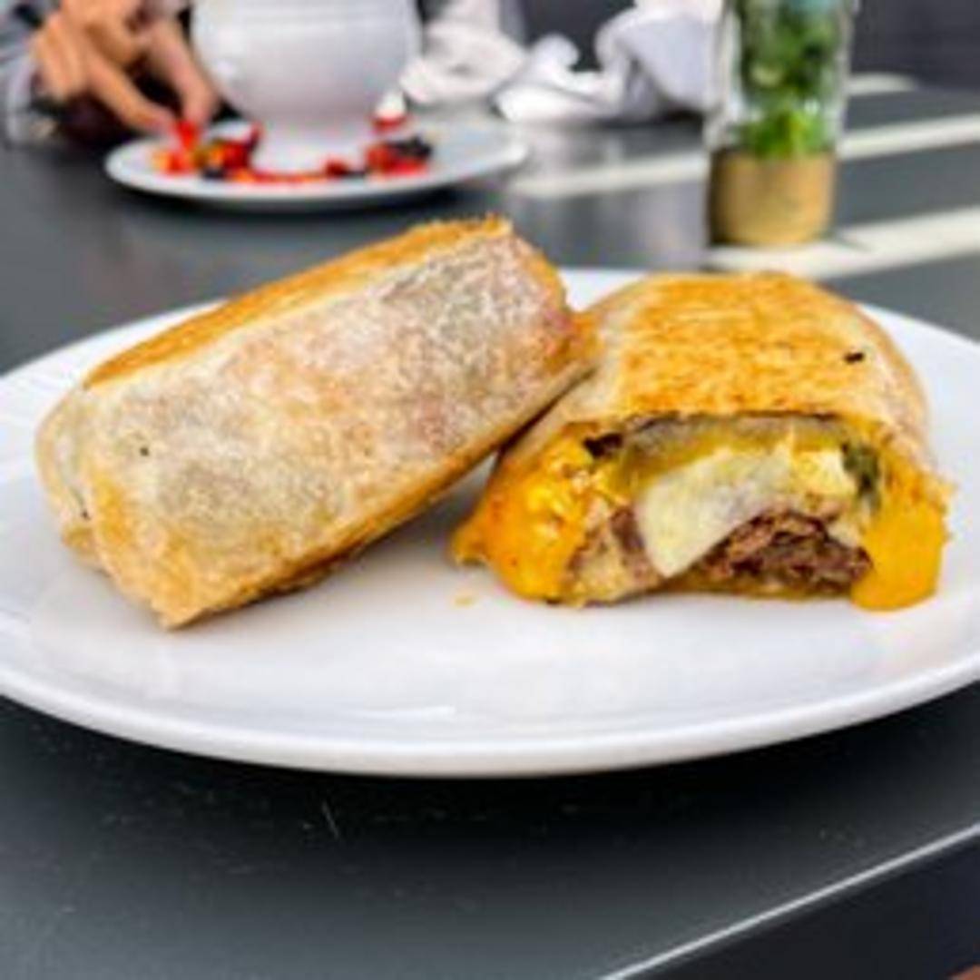 A large flour tortilla filled with scrambled eggs, cheese, your choice of meat (bacon, sausage, or chorizo), potatoes, and salsa.