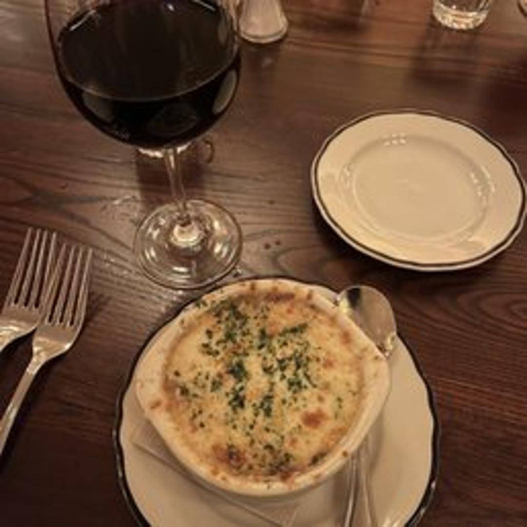 A heartwarming bowl of caramelized sweet onions simmered in a savory beef broth, topped with a toasted baguette slice and generously blanketed with a bubbling layer of melted Gruyère cheese.