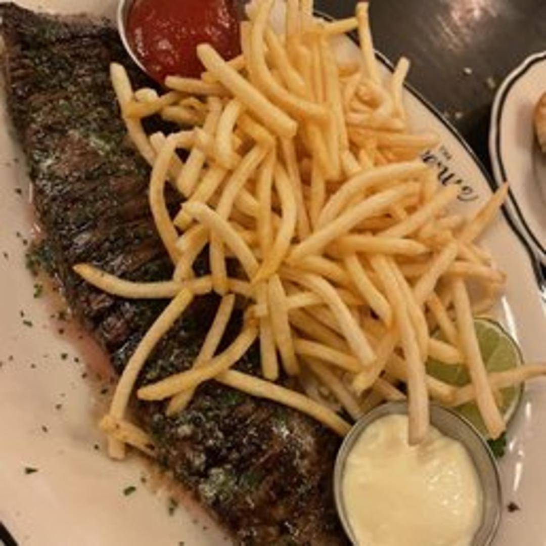 A beloved bistro classic, presenting thinly sliced, perfectly grilled steak (often a flavorful cut like sirloin or hanger steak) cooked to your preference, accompanied by a generous portion of golden, crispy shoestring French fries. Typically served with a signature house butter or sauce.