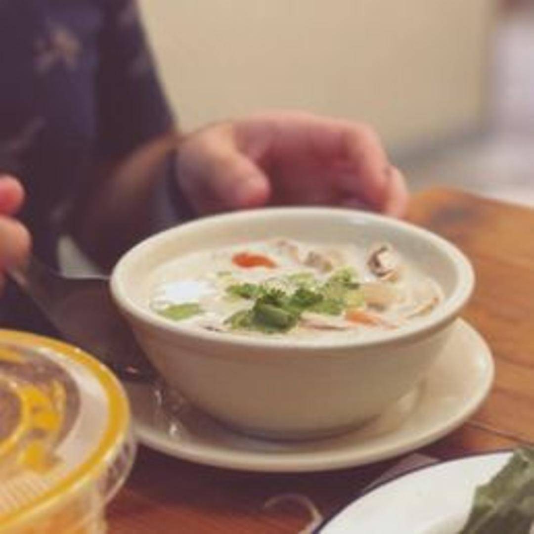 A creamy and aromatic coconut milk soup infused with galangal, lemongrass, kaffir lime leaves, mushrooms, tomatoes, and chicken. Features a delicate balance of sweet, sour, and savory flavors, garnished with cilantro.