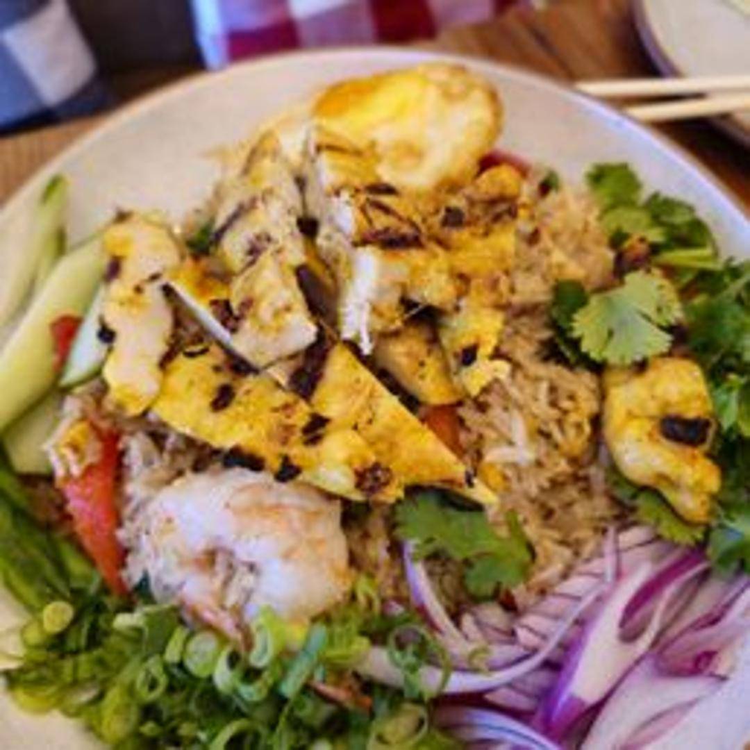 Indonesian-style fried rice with chicken, shrimp, and vegetables in a sweet and savory sauce, often topped with a fried egg and crispy shallots.