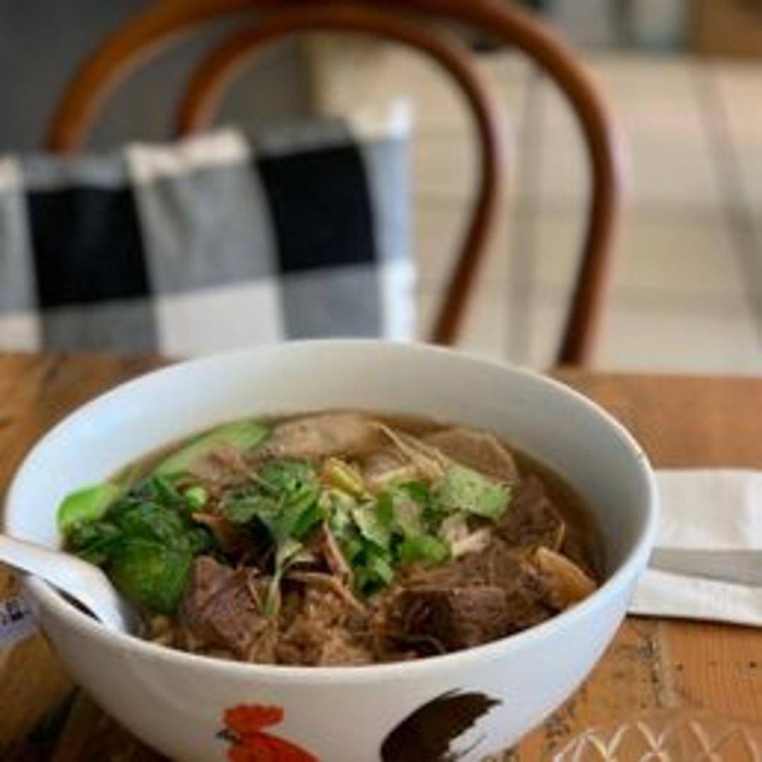 A hearty noodle soup with tender stewed beef, vegetables, and herbs in a rich and flavorful broth.