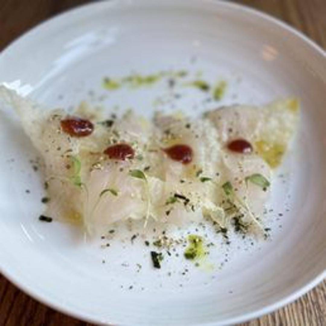 Thinly sliced raw sea bass, delicately seasoned with citrus, olive oil, and fresh herbs. Garnished with microgreens and served chilled.