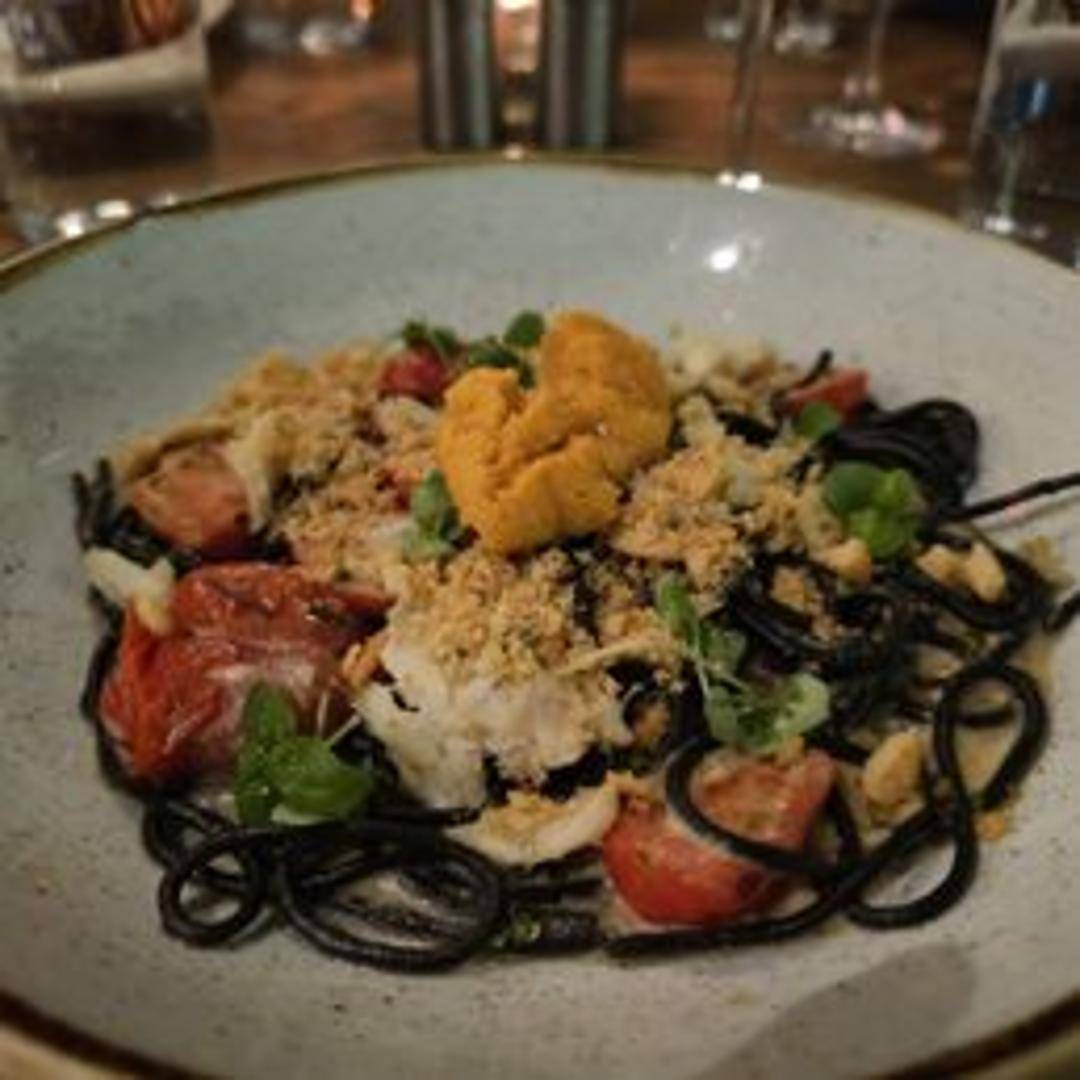 Fresh squid ink pasta tossed with shrimp, calamari, mussels, garlic, chili flakes, and a light tomato sauce.