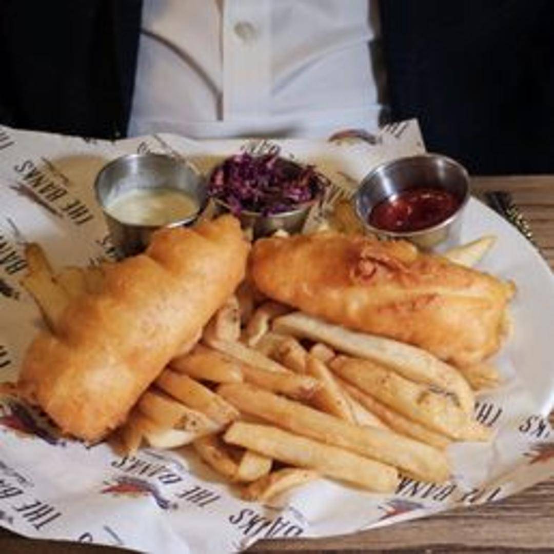 Crispy battered fresh cod served with thick-cut fries, tartar sauce, and a lemon wedge.