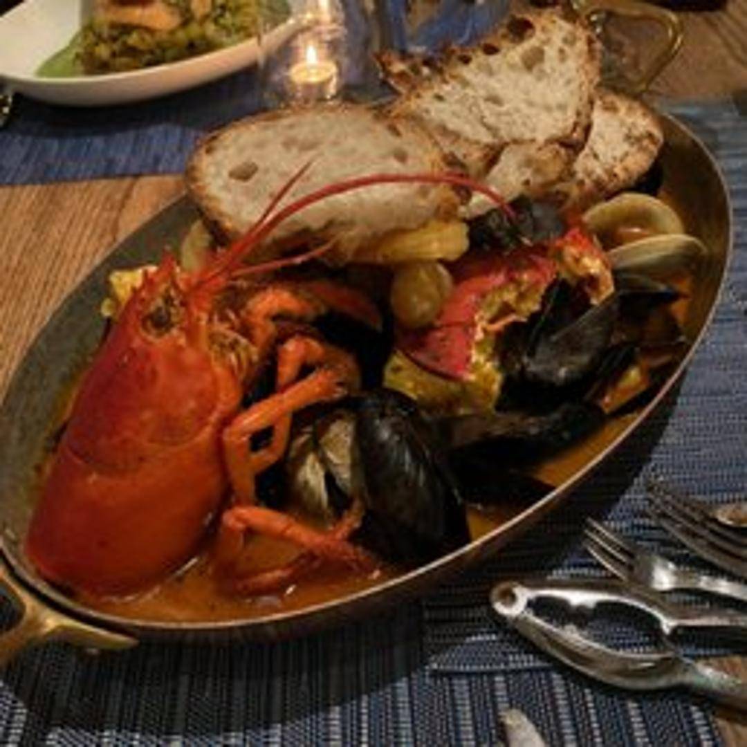A classic New England feast featuring a succulent whole lobster, steamed clams, mussels, potatoes, and corn on the cob, all cooked together in a flavorful broth.