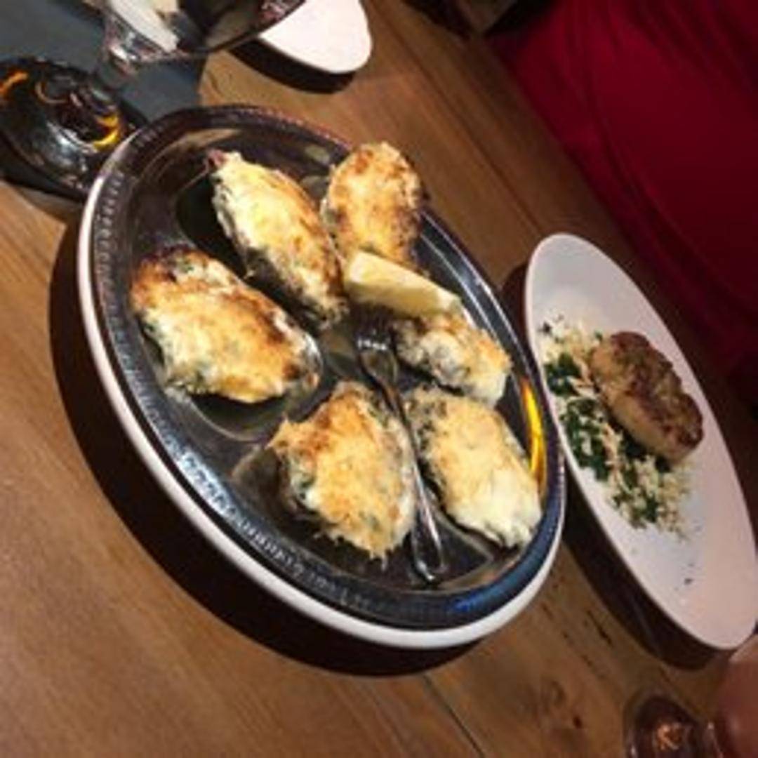 A delightful appetizer featuring succulent oysters baked to perfection, topped with a rich medley of seasoned breadcrumbs, savory herbs, and grated cheese, creating a harmonious blend of flavors and textures.