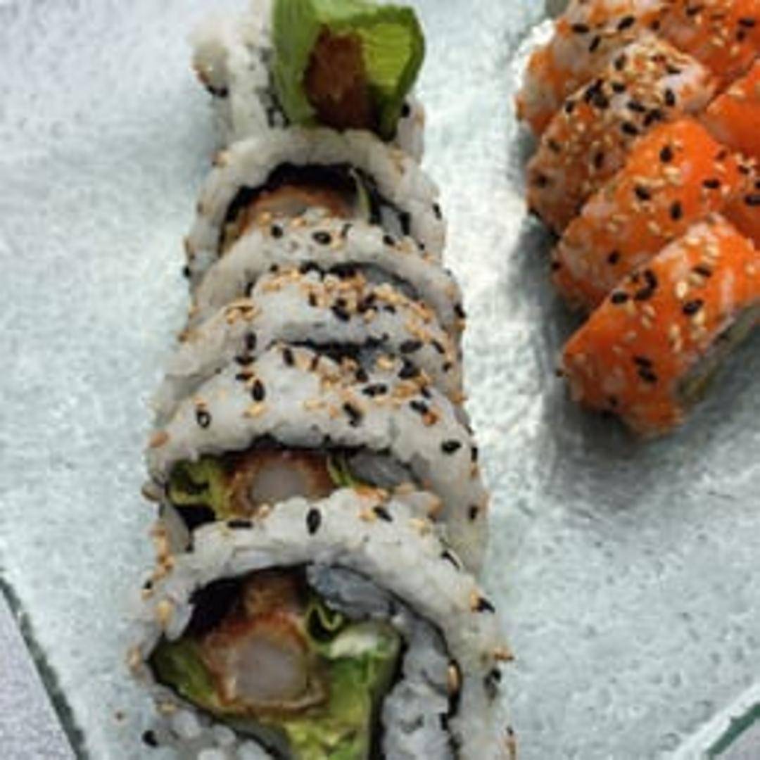A sushi roll featuring crispy shrimp tempura as the main ingredient. Typically includes rice, seaweed (nori), and other fillings such as avocado, cucumber, and sometimes spicy mayonnaise. The roll is often topped with sesame seeds and served with soy sauce, wasabi, and ginger.
