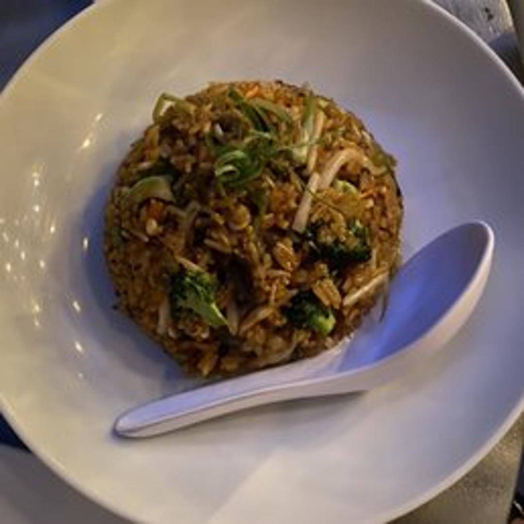 Savory fried rice prepared in a traditional Thai style, featuring fluffy rice wok-tossed with eggs, onions, carrots, peas, and your choice of protein (chicken, pork, beef, shrimp, or tofu). Seasoned with authentic Thai sauces and spices for a balanced sweet, sour, and savory flavor profile.
