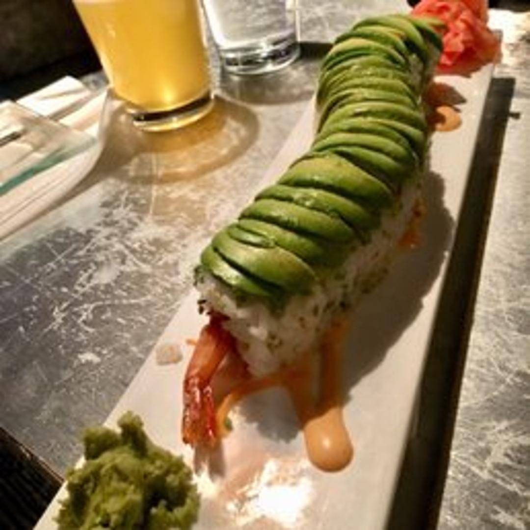 A colorful and flavorful sushi roll. Expect ingredients like spicy tuna, avocado, cream cheese, cucumber, and possibly topped with mango or strawberry, drizzled with a sweet sauce.