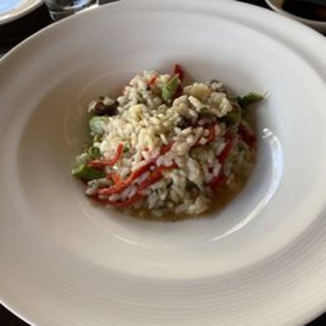 A creamy and vibrant Arborio rice dish featuring seasonal summer vegetables like sweet corn, zucchini, and bell peppers, finished with fresh basil, Parmesan cheese, and a drizzle of extra virgin olive oil.