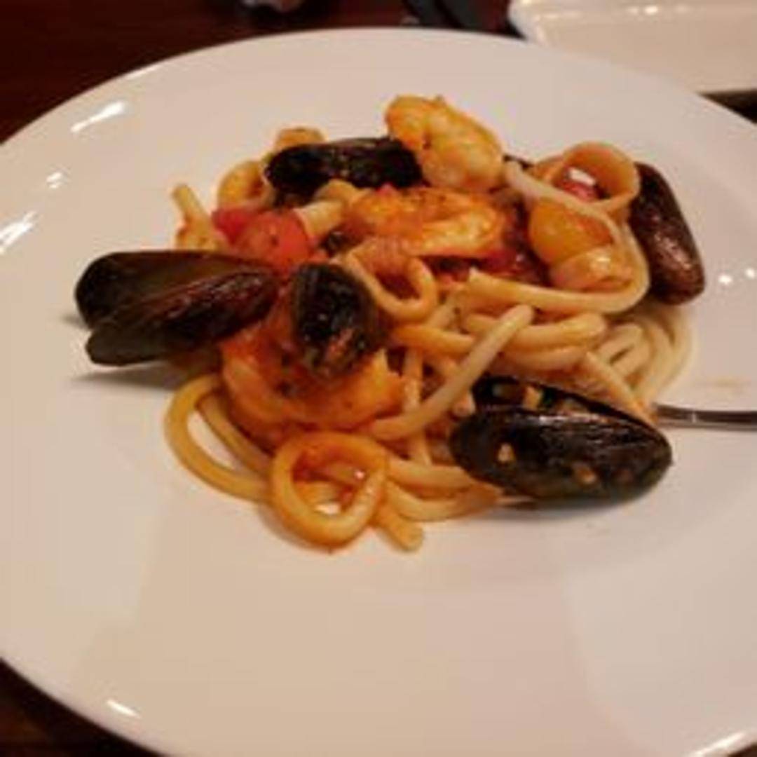 Thick, spaghetti-like pasta with a hole running through the center, tossed in a rich and savory sauce made with slow-cooked tomatoes, garlic, herbs, and a hint of chili flakes. Finished with grated Pecorino Romano cheese and a drizzle of extra virgin olive oil.