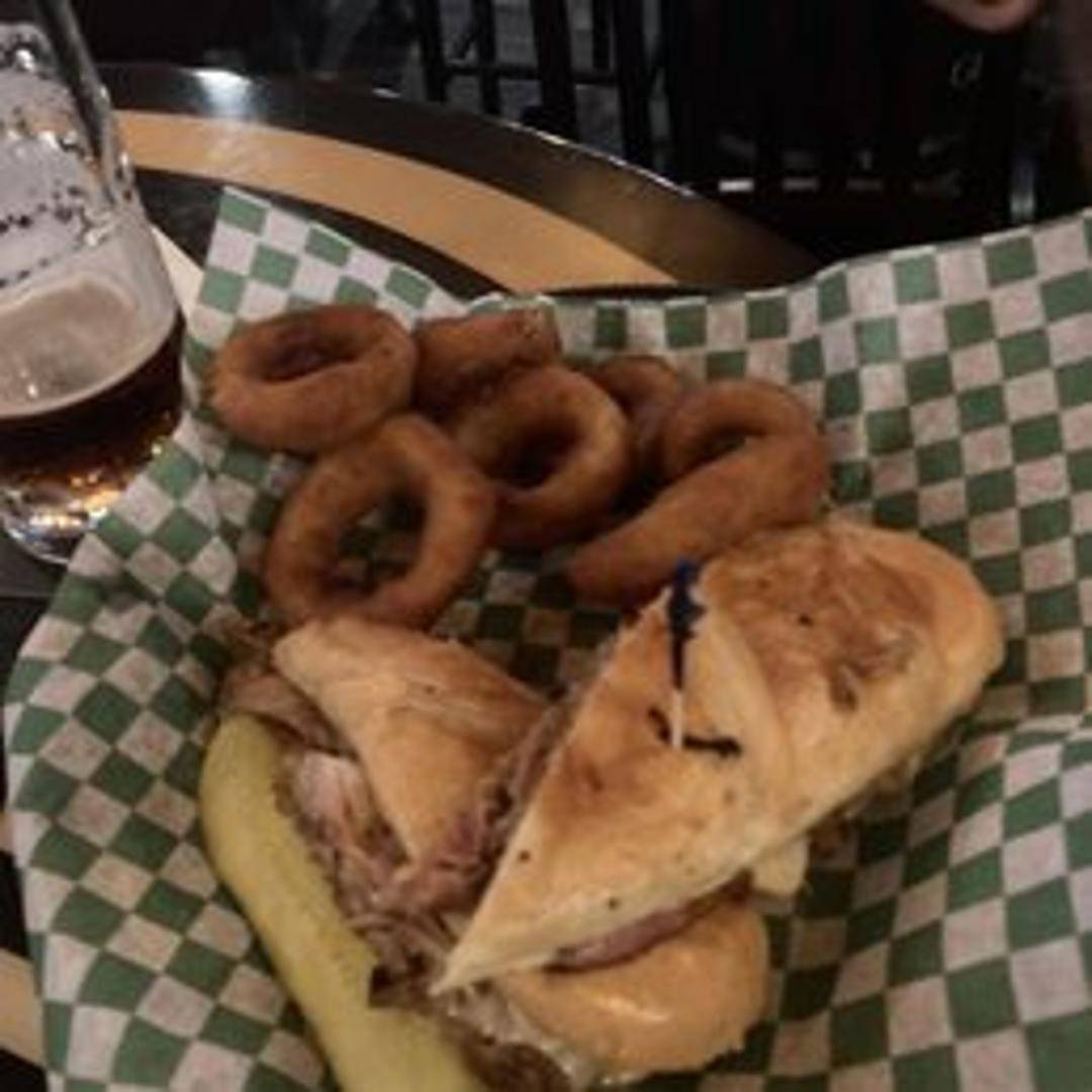 A delicious pressed sandwich featuring roasted pork, ham, Swiss cheese, pickles, and mustard on Cuban bread. Grilled to golden perfection.