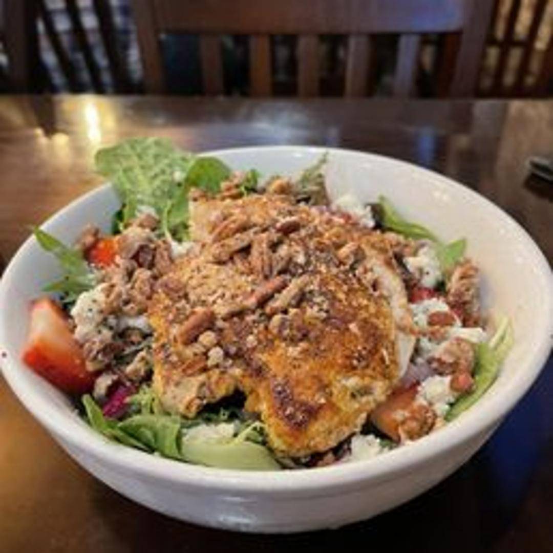 Fresh strawberries and crunchy pecans atop a bed of mixed greens, tossed in a light vinaigrette. A refreshing and seasonal salad.