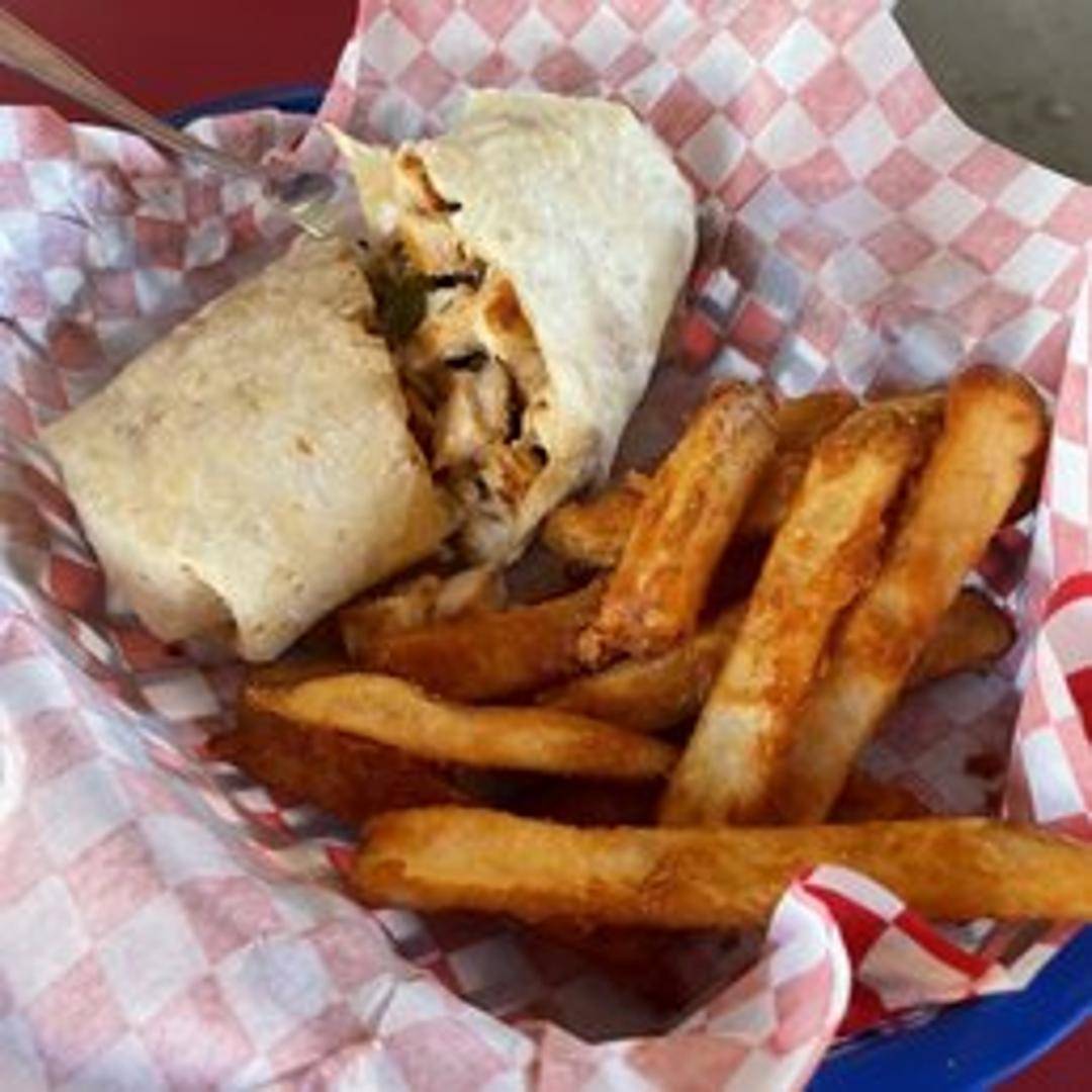 A handheld meal featuring ingredients wrapped in a soft tortilla. Filling options vary and may include meats, vegetables, cheeses, and sauces. Ask about today's selection.