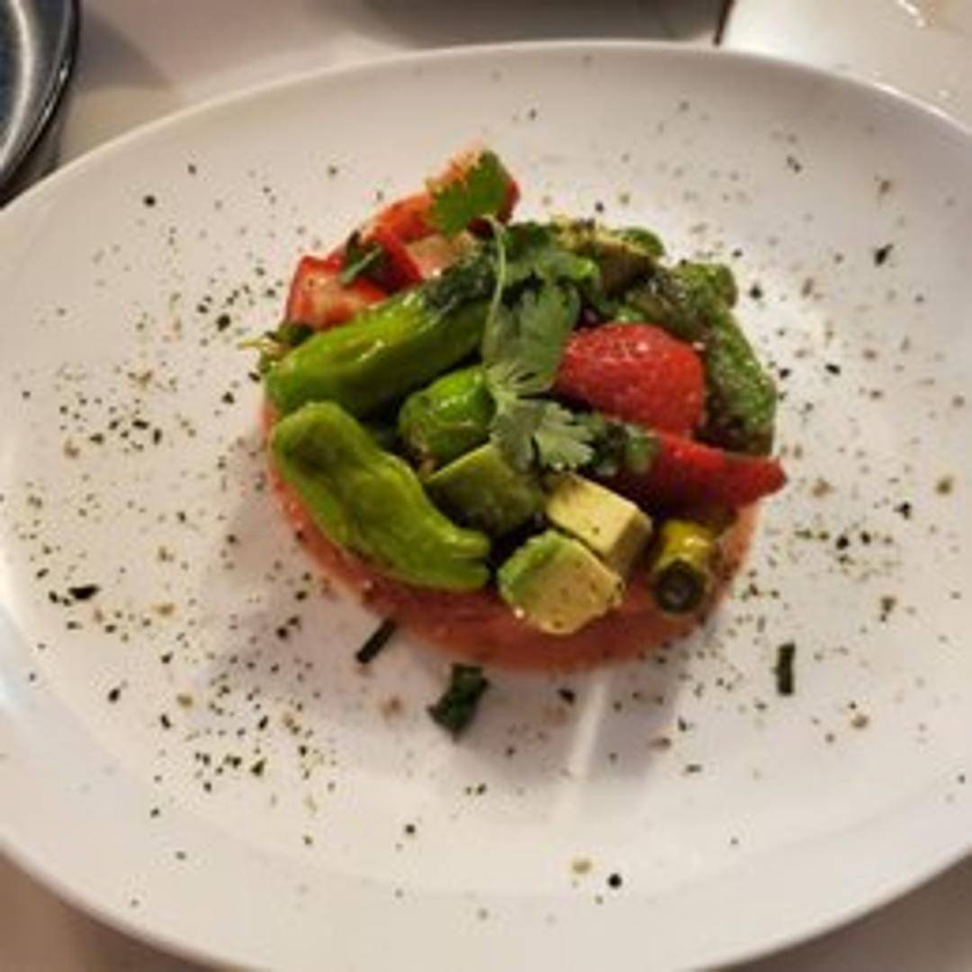 A delightful and unexpected appetizer! Tender shishito peppers are blistered to perfection and then tossed with a vibrant strawberry glaze. The slight heat of the pepper balances beautifully with the sweet and tangy fruit, creating a complex and addictive flavor profile. Enjoy as a shared plate or a unique start to your meal.