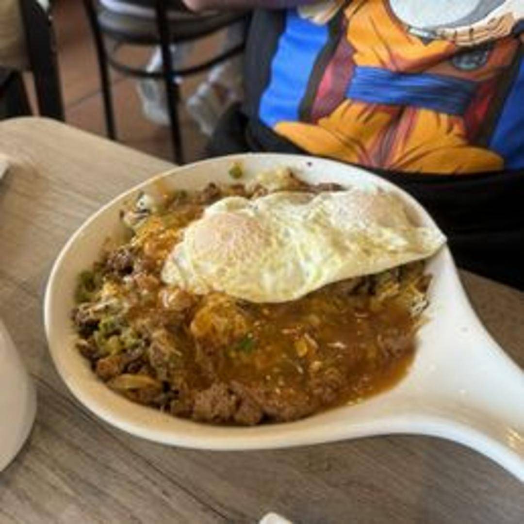 A hearty skillet filled with seasoned potatoes, scrambled eggs, bell peppers, onions, cheese, and your choice of bacon, sausage, or chorizo. Served with a side of toast or tortillas.