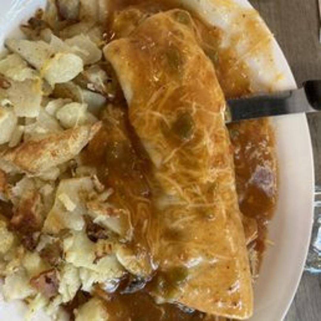A large flour tortilla filled with scrambled eggs, potatoes, cheese, and your choice of bacon, sausage, or chorizo. Smothered in your choice of green chili or cheese sauce.