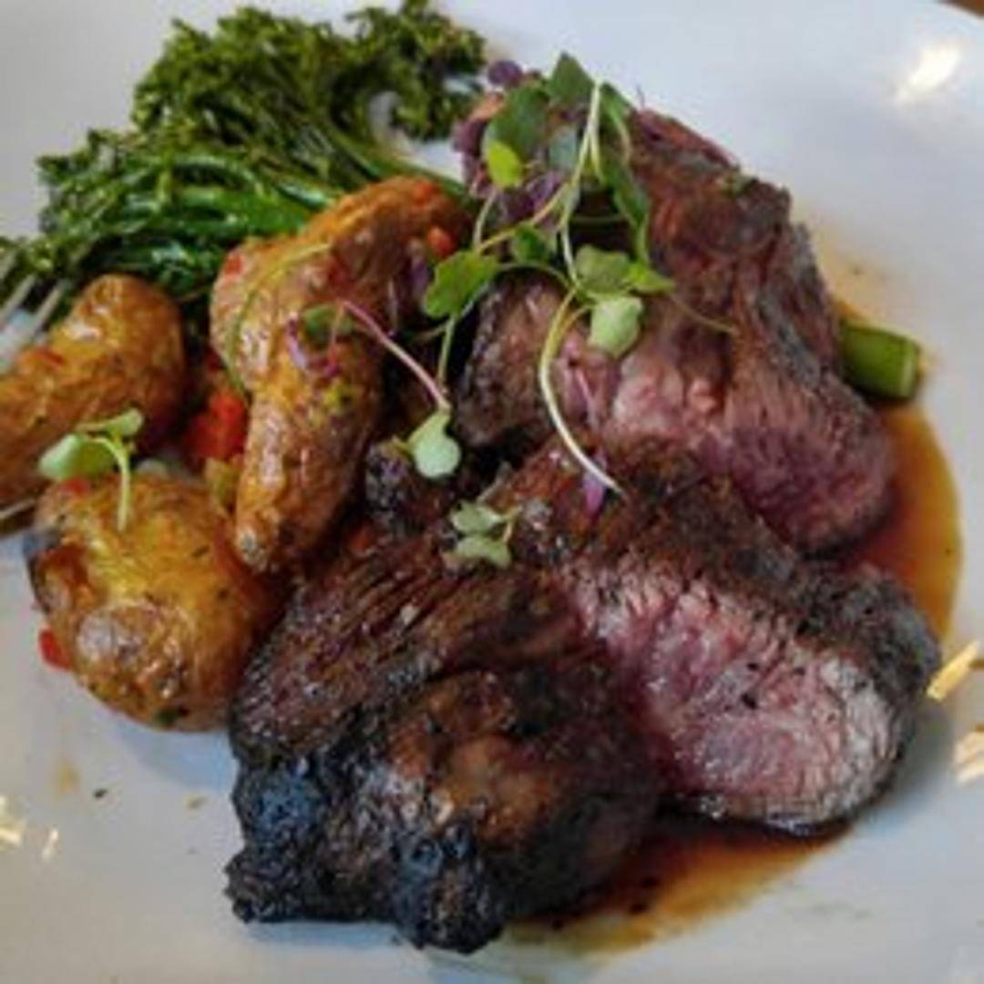A succulent and richly flavorful hanger steak, expertly grilled to perfection, boasting a tender interior and a beautifully seared crust. Served with a vibrant chimichurri sauce and a medley of seasonal roasted vegetables, highlighting the steak's robust character.