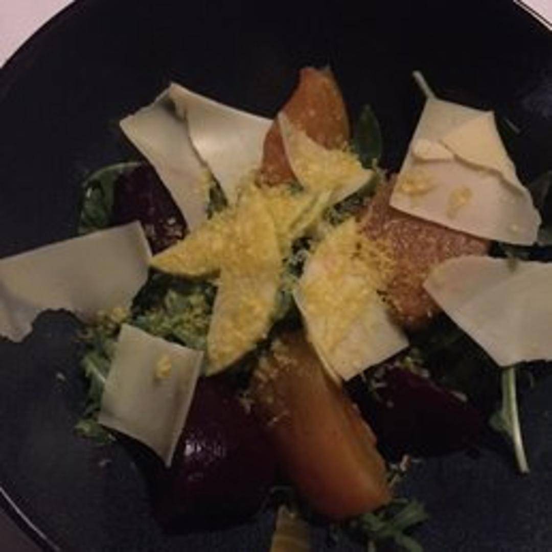 A vibrant and refreshing salad showcasing tender roasted red and golden beets, perfectly paired with crumbled goat cheese, candied walnuts, and crisp arugula. Drizzled with a zesty citrus vinaigrette, offering a delightful balance of earthy, sweet, and tangy notes.