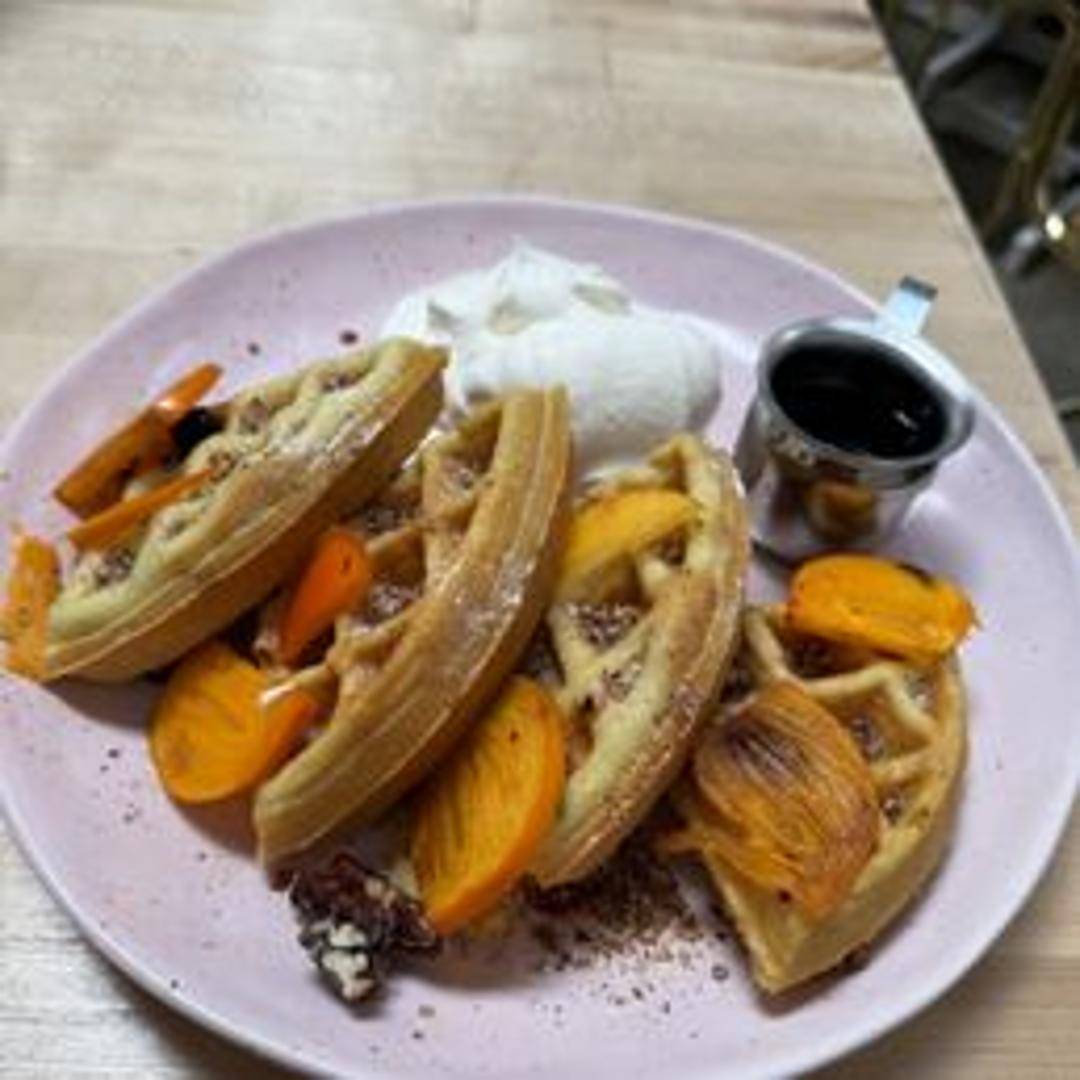 A light and fluffy waffle infused with lemon zest and lavender, served with a dollop of whipped cream (often vegan or plant-based), fresh berries, and a drizzle of maple syrup.