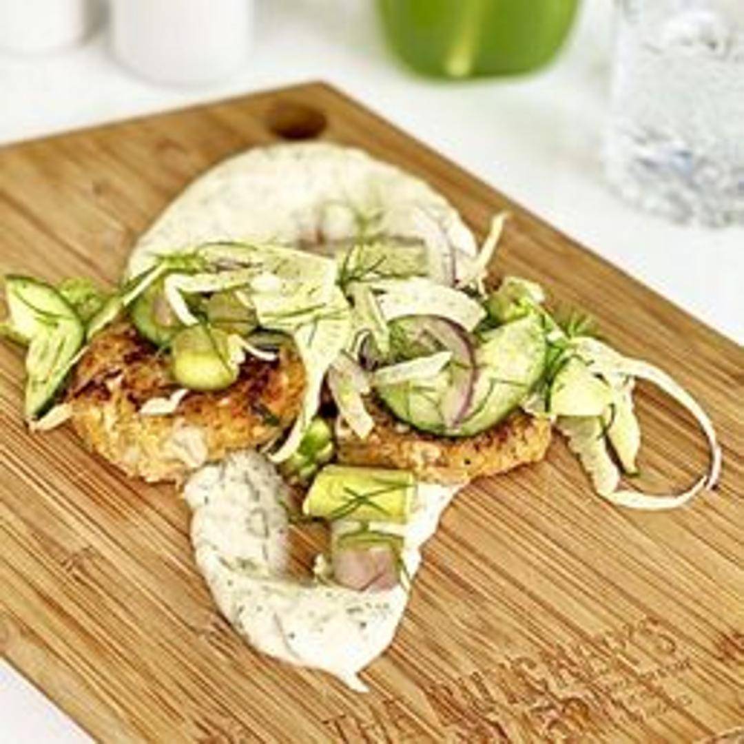 Savory jackfruit 'crab cakes' served on toasted English muffins with wilted spinach, poached eggs, and hollandaise sauce.