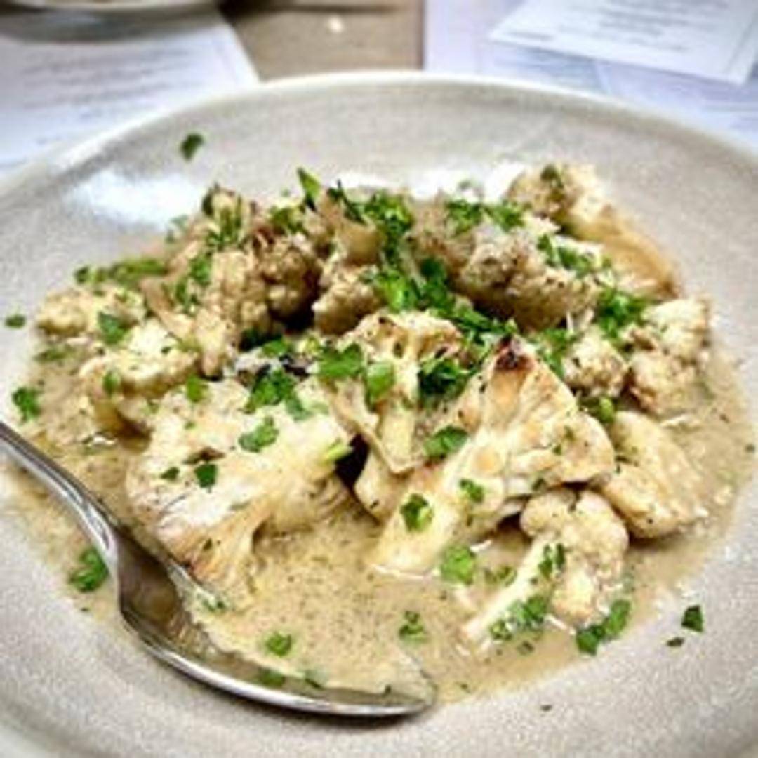 Roasted cauliflower florets tossed in a creamy, vegan cashew-based cacio e pepe sauce with black pepper and nutritional yeast, served over gluten-free pasta.