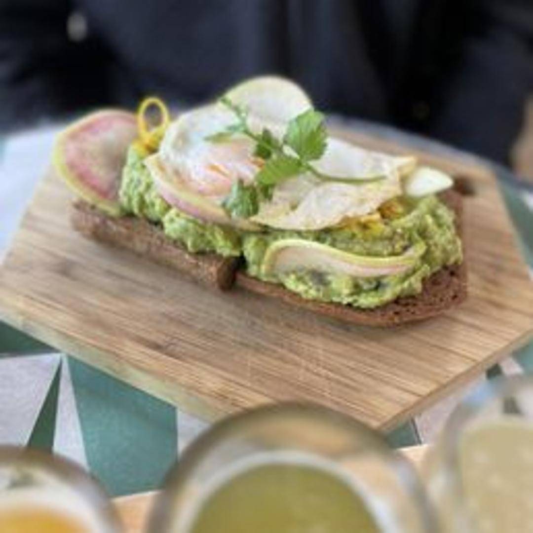 Thick-cut multigrain toast topped with smashed avocado, everything bagel seasoning, chili flakes, and a drizzle of olive oil. Served with a side of pickled onions.