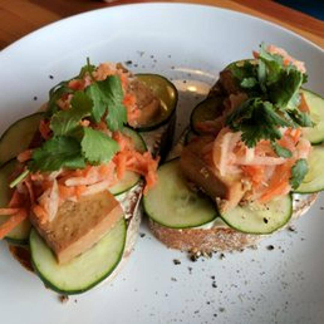 Toasted bread topped with pickled vegetables, pate, cilantro, and spicy mayo.