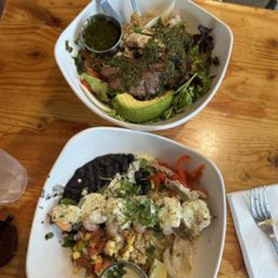 A health-conscious bowl adhering to paleo dietary principles. Typically includes a base of cauliflower rice or mixed greens, topped with grilled chicken or lean protein, roasted vegetables such as sweet potatoes, broccoli, and bell peppers, and avocado. Dressed with a light vinaigrette or olive oil.