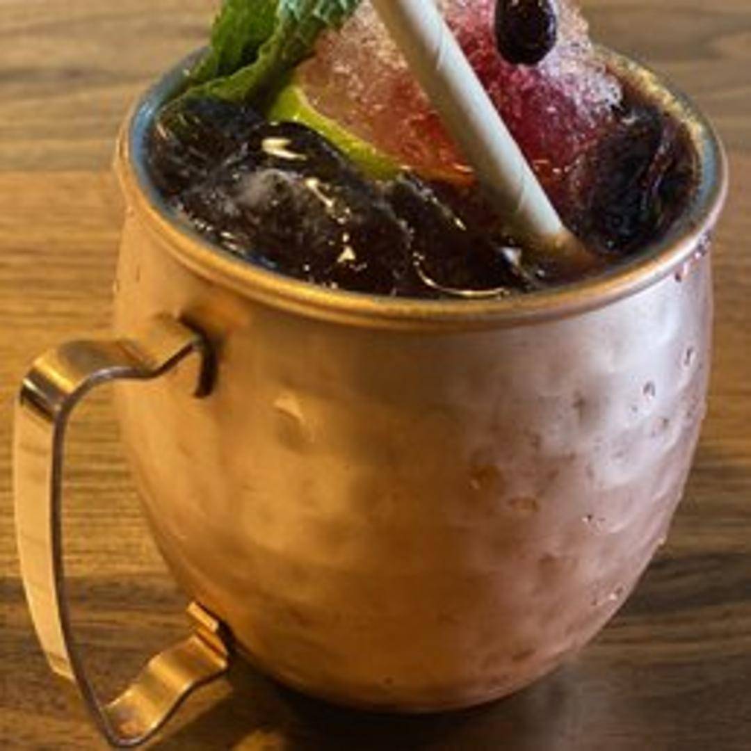 A refreshing twist on the classic Moscow Mule, featuring Wild Blue Vodka, ginger beer, and a squeeze of lime. Served in a copper mug.