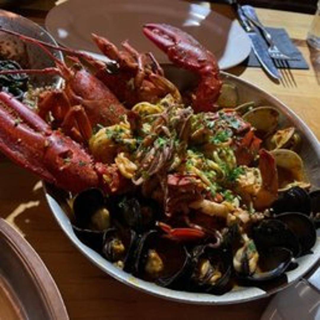 Pasta tossed with generous chunks of succulent lobster meat in a flavorful sauce, typically a tomato-based or creamy sauce.