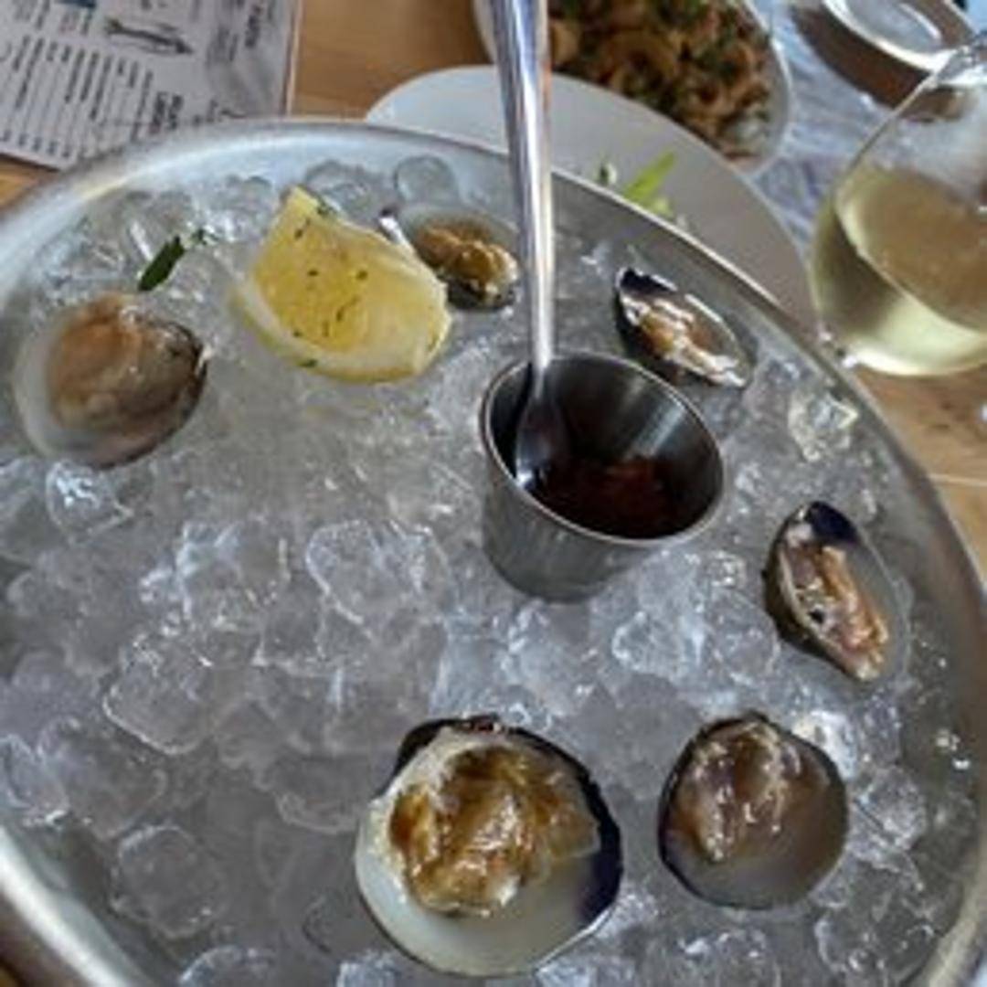 A bowl of steamed little neck clams, served in a flavorful broth of garlic, herbs, and white wine.