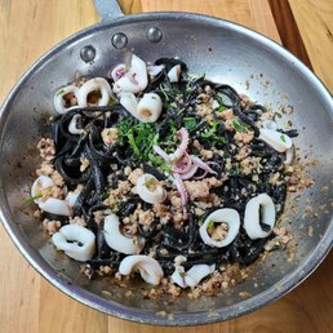 Homemade black pasta, colored with squid ink, tossed in a light garlic and oil sauce with fresh seafood, often including shrimp, scallops, and calamari.