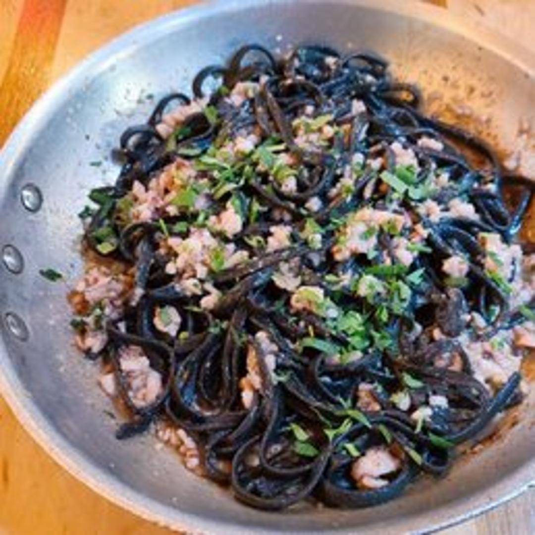 Homemade squid ink infused pasta, typically served with a seafood sauce, often featuring calamari, shrimp and scallops in a light tomato-based or garlic-wine sauce.