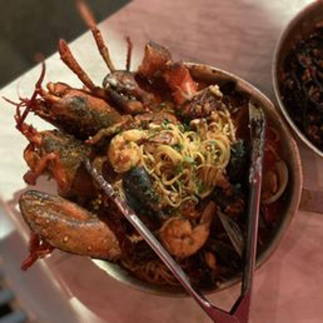 Fresh lobster simmered in a spicy tomato sauce with garlic, herbs, and a touch of red pepper flakes. Served over linguine.