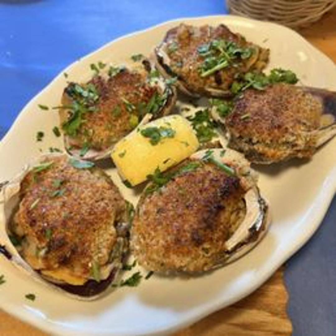 Fresh littleneck clams baked with a savory mixture of peppers, onions, bacon, and breadcrumbs, then drizzled with butter and baked until golden brown.